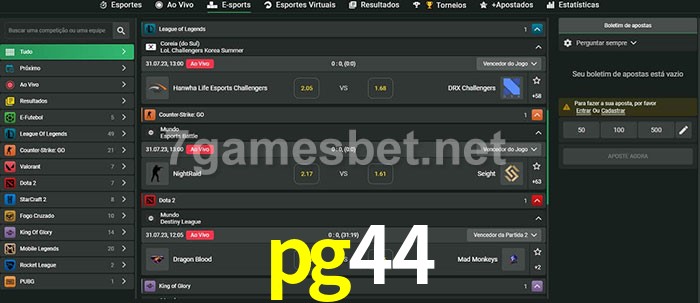 O pg44 oferece uma grande seleção de opções de apostas em e-sports com probabilidades competitivas